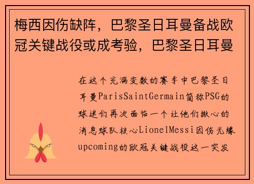 梅西因伤缺阵,巴黎圣日耳曼备战欧冠关键战役或成考验,巴黎圣日耳曼首发梅西