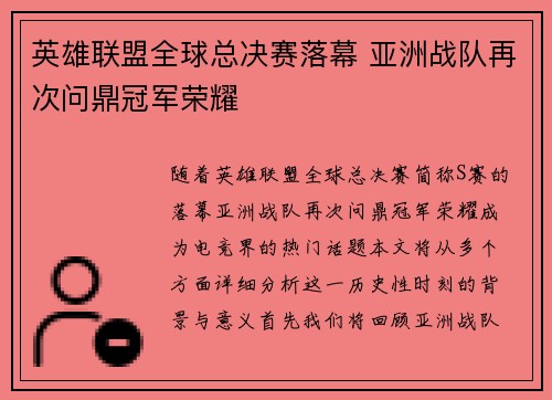 英雄联盟全球总决赛落幕 亚洲战队再次问鼎冠军荣耀